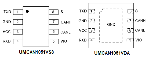 - UMCAN1051VS8 和 UMCAN1051VDA 上的VIO输入允许直接连接至3.3V或5V微控制器